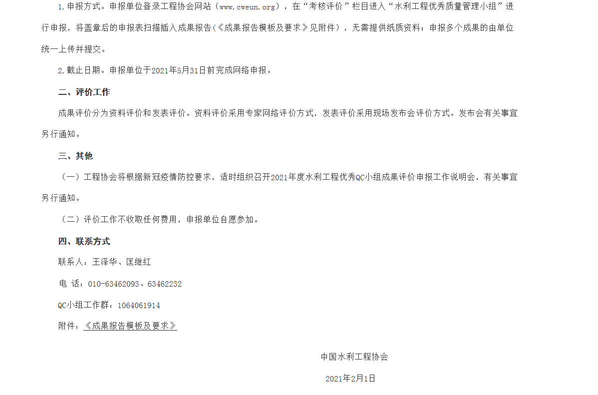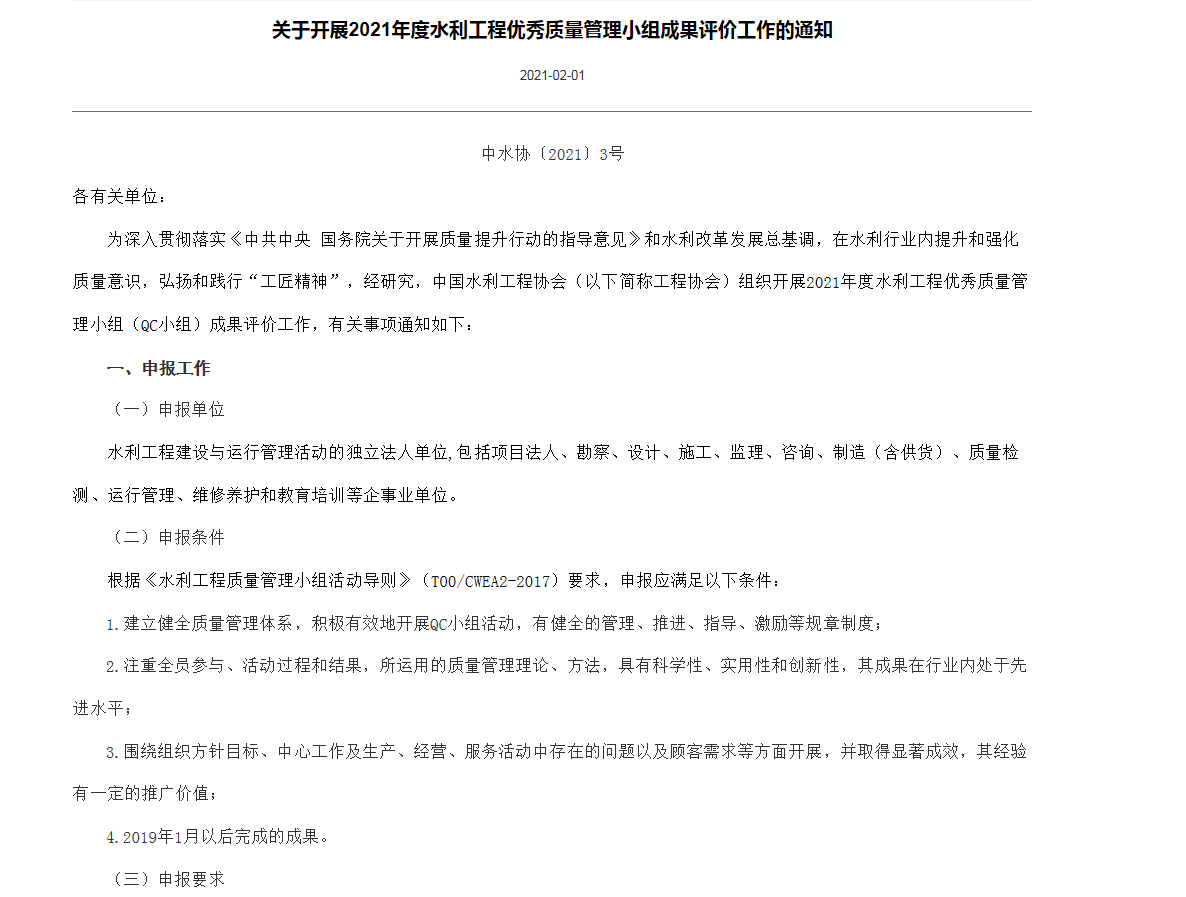 關(guān)于開(kāi)展2021年度水利工程優(yōu)秀質(zhì)量管理小組成果評(píng)價(jià)工作的通知