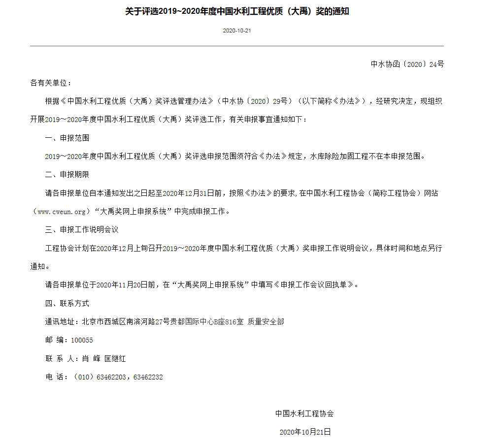 關(guān)于評選2019~2020年度中國水利工程優(yōu)質(zhì)(大禹)獎的通知