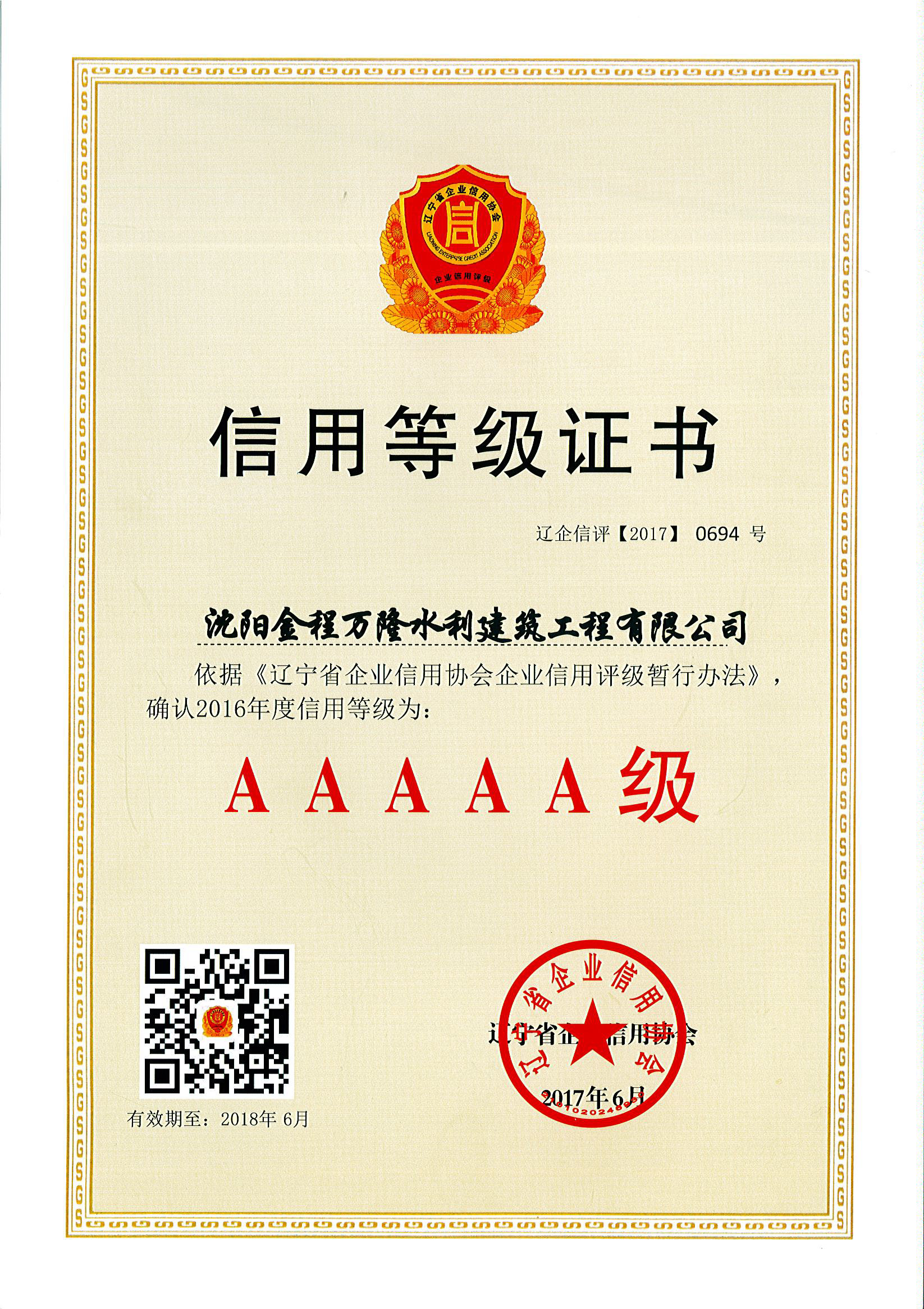 2016年度省5A級(jí)“信用等級(jí)證書”
